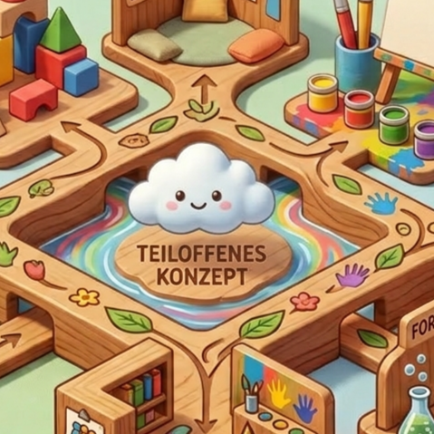 Das teiloffene Konzept in der Kita verbindet feste Gruppenstrukturen mit offenen Spiel- und Lernphasen, in denen Kinder selbst entscheiden können, in welchen Räumen oder Angeboten sie sich aufhalten möchten. Dadurch werden sowohl Sicherheit und Zugehörigkeit, als auch Selbstständigkeit, Mitbestimmung und individuelle Förderung unterstützt.